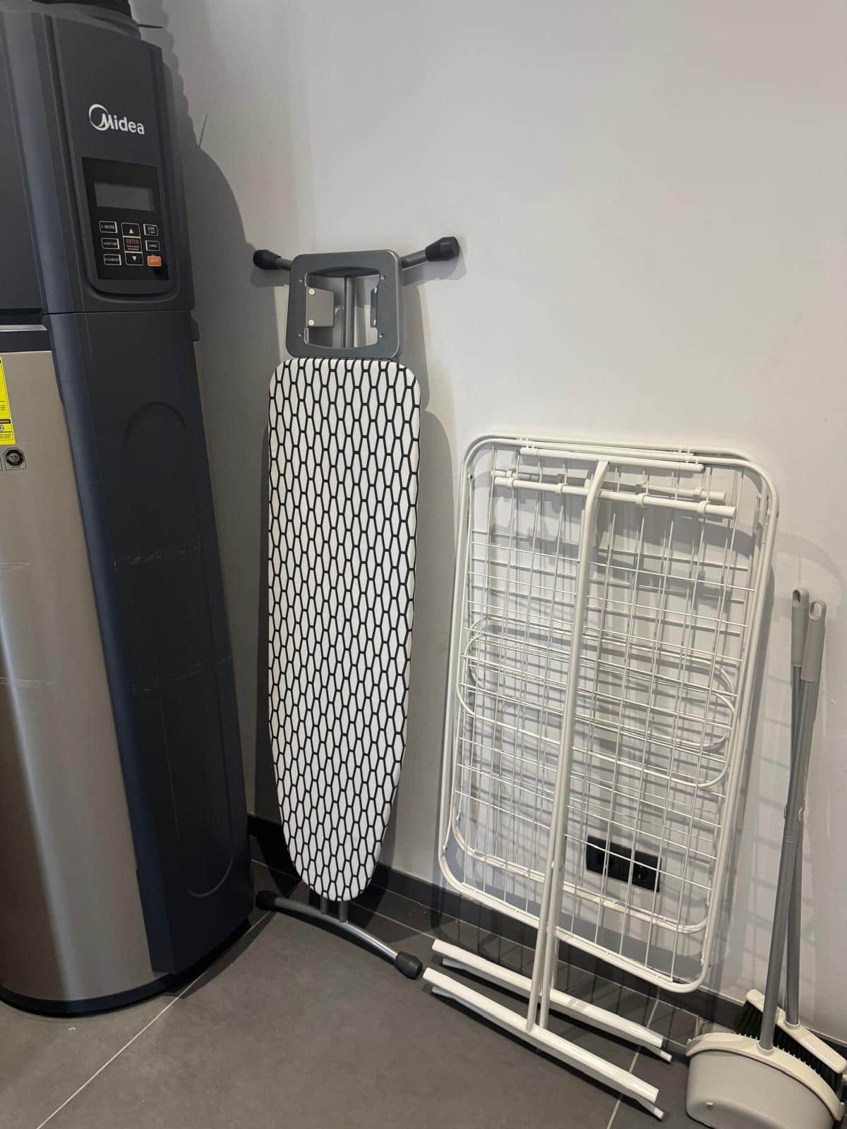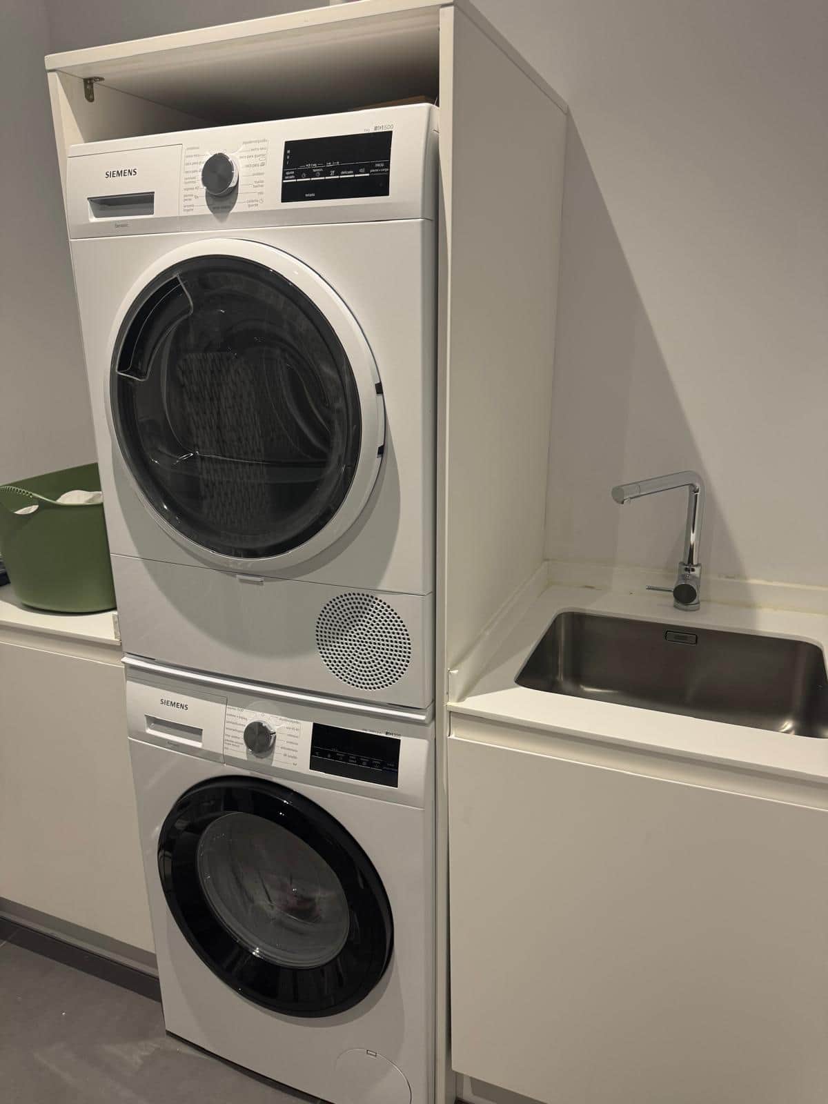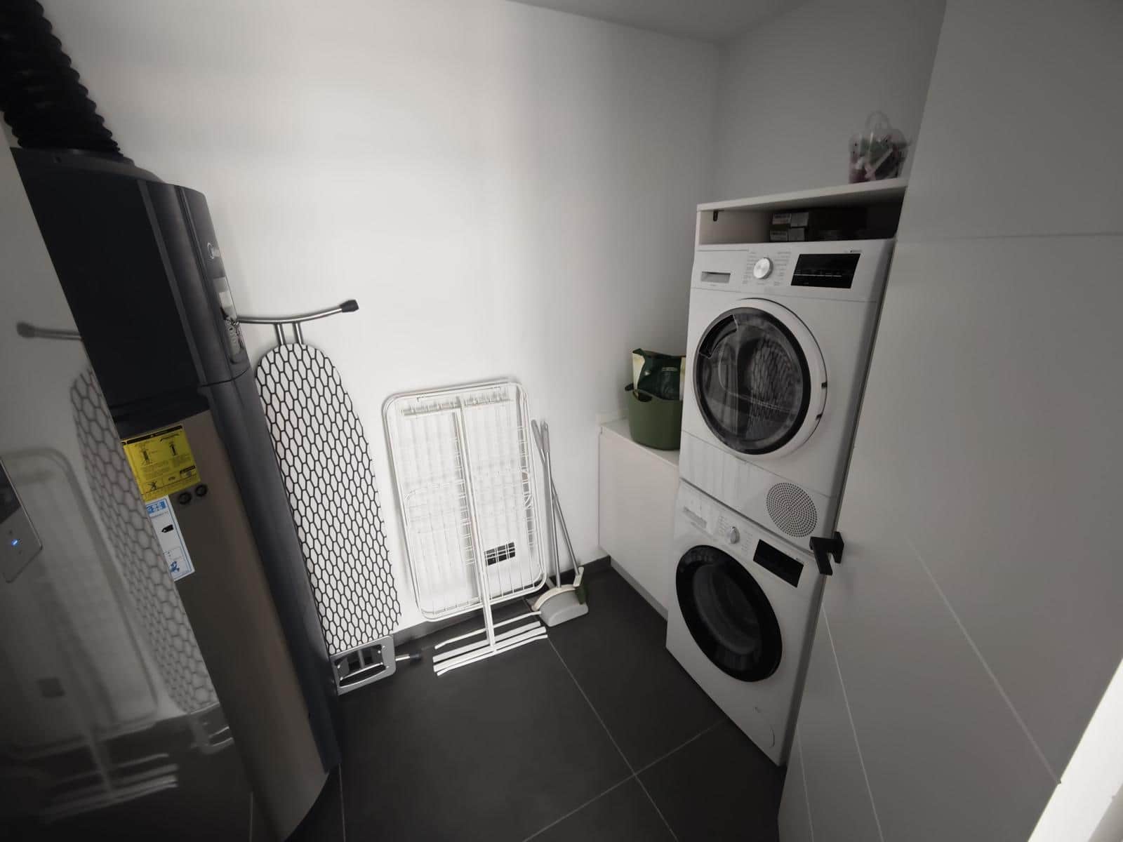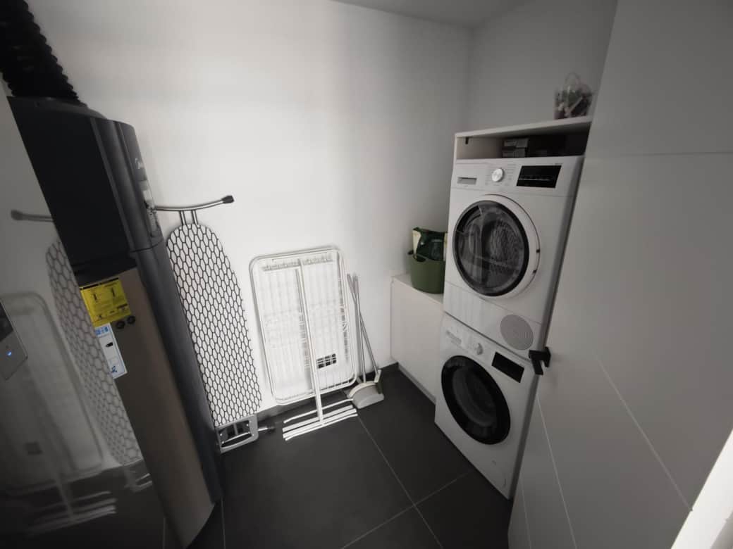 Fully equipped with a washing machine, dryer, pot-washing basin, and storage.