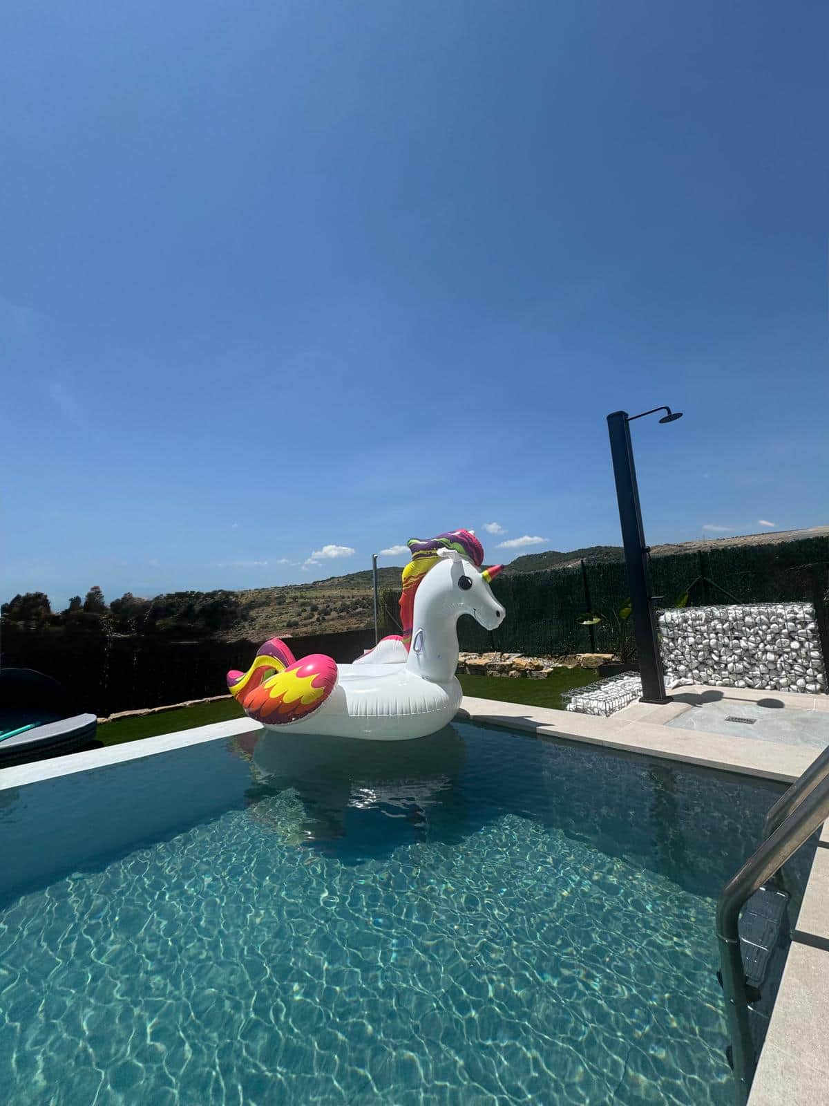 Six sun loungers, two water loungers, and a large day bed with a canopy for ultimate comfort and relaxation. Ambient Lighting – Solar lamps and elegant garden lighting enhance the atmosphere, ensuring a tranquil and inviting environment throughout the day and night.
